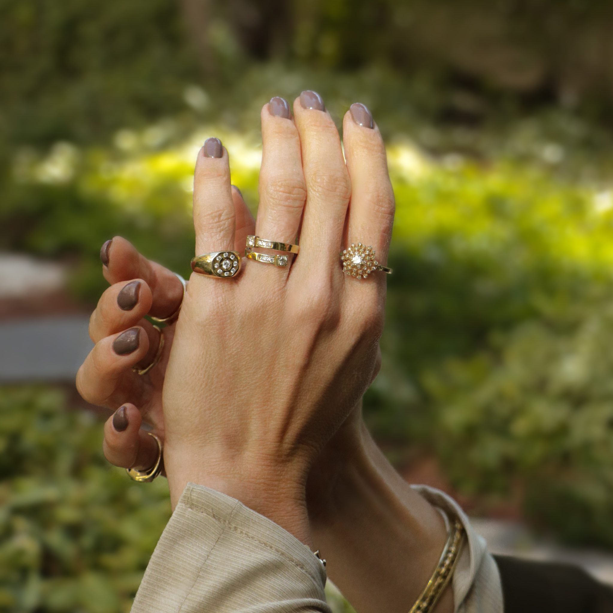 טבעת חותם בעיצוב מתומן, משובצת 8 יהלומים 0.02 קראט ליחידה ויהלום מרכזי 0.07 קראט.