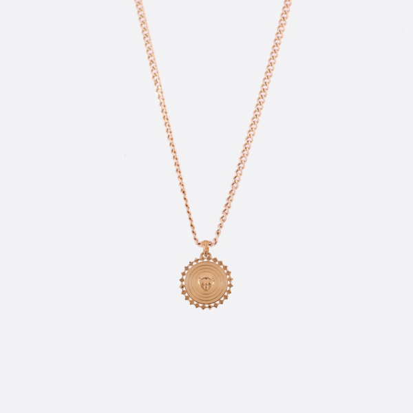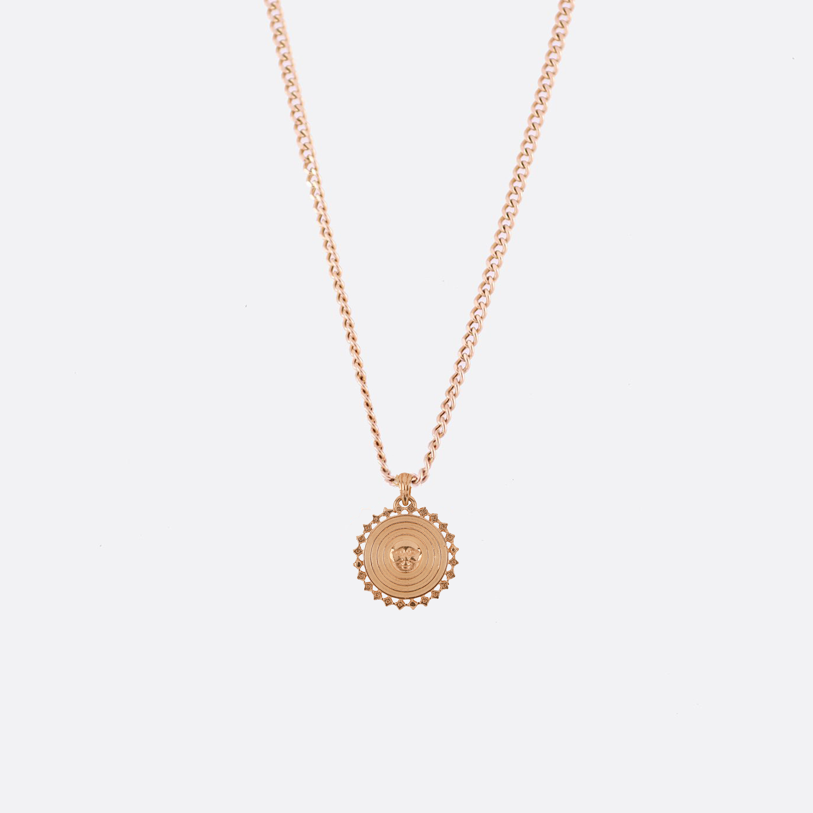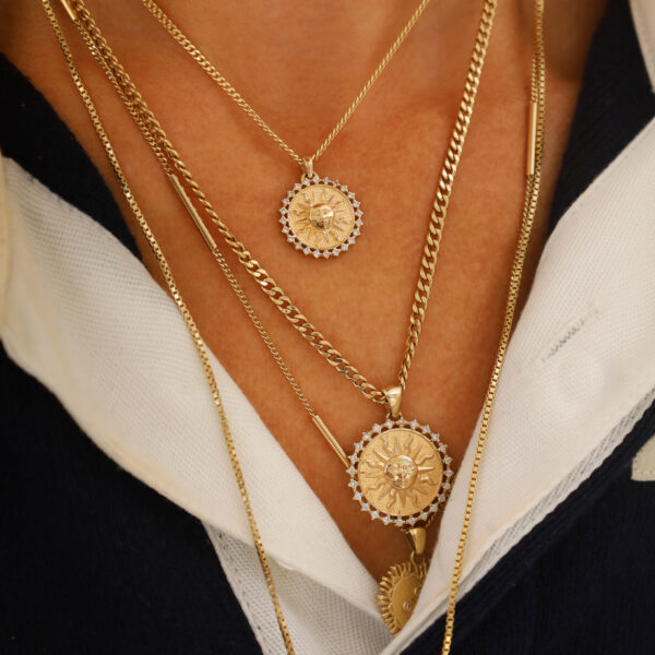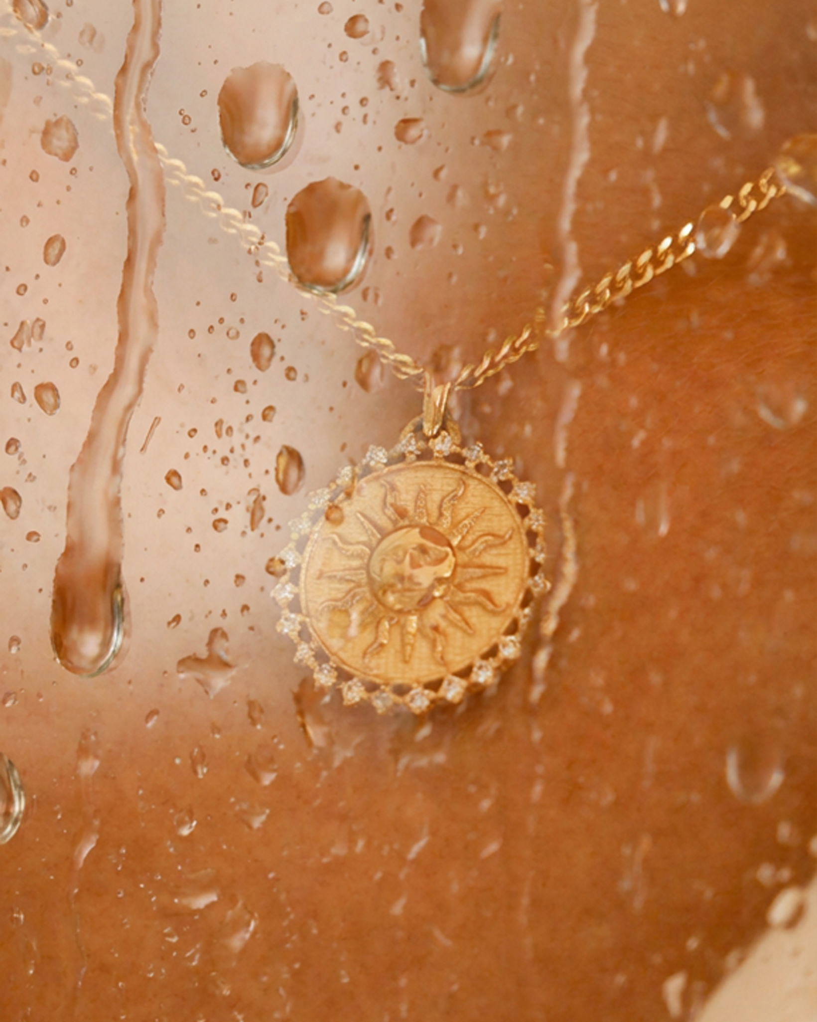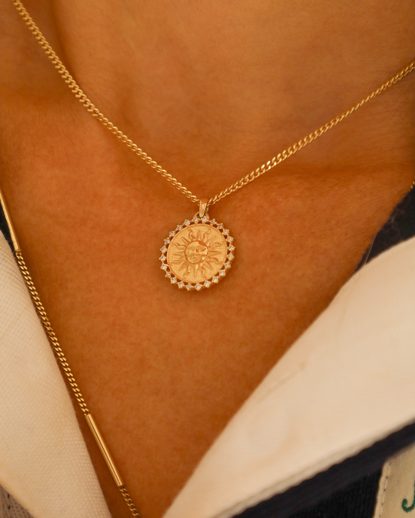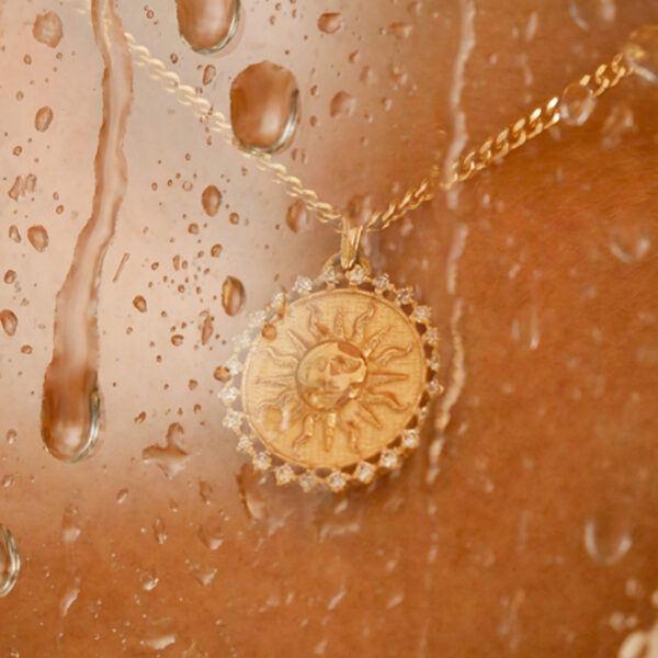 תליון דו צדדי, מצד אחד תבליט של שמש עם פנים וקרניים ומסגרת מעוטרת יהלומים ומהצד השני תבליט של ירח עם פנים ומעגלים מסביב.