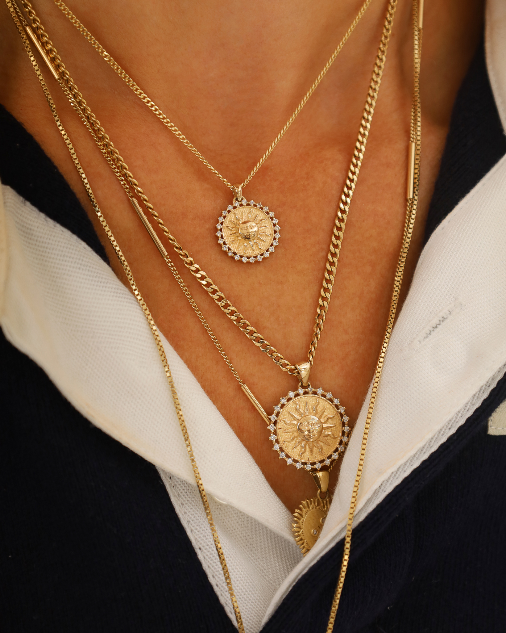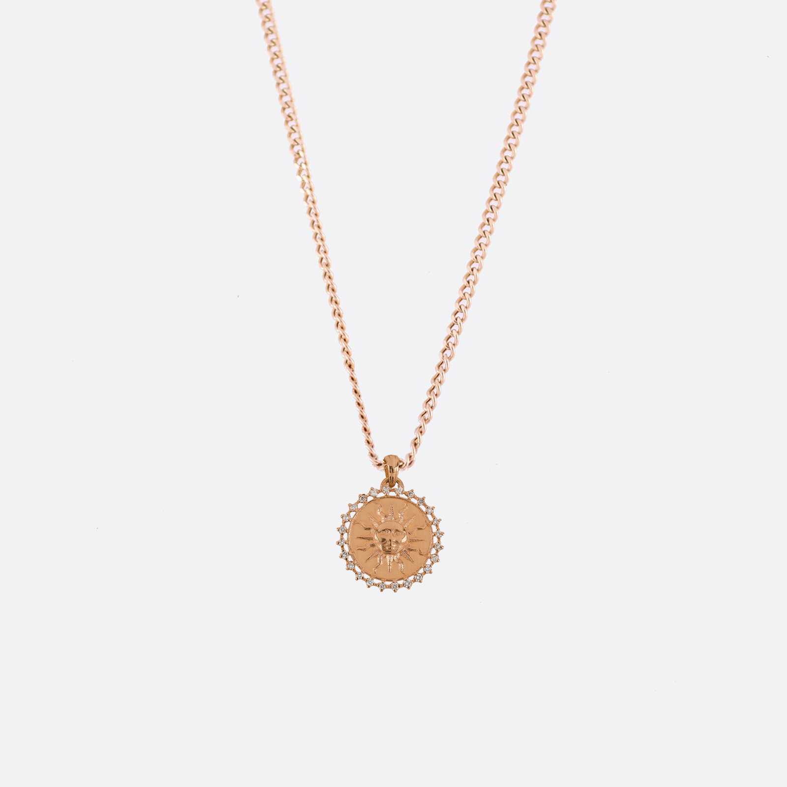 A delicate double-sided pendant featuring a sun on one side and a moon on the other, set with 23 diamonds of 0.01 ct each (VS clarity, H color).