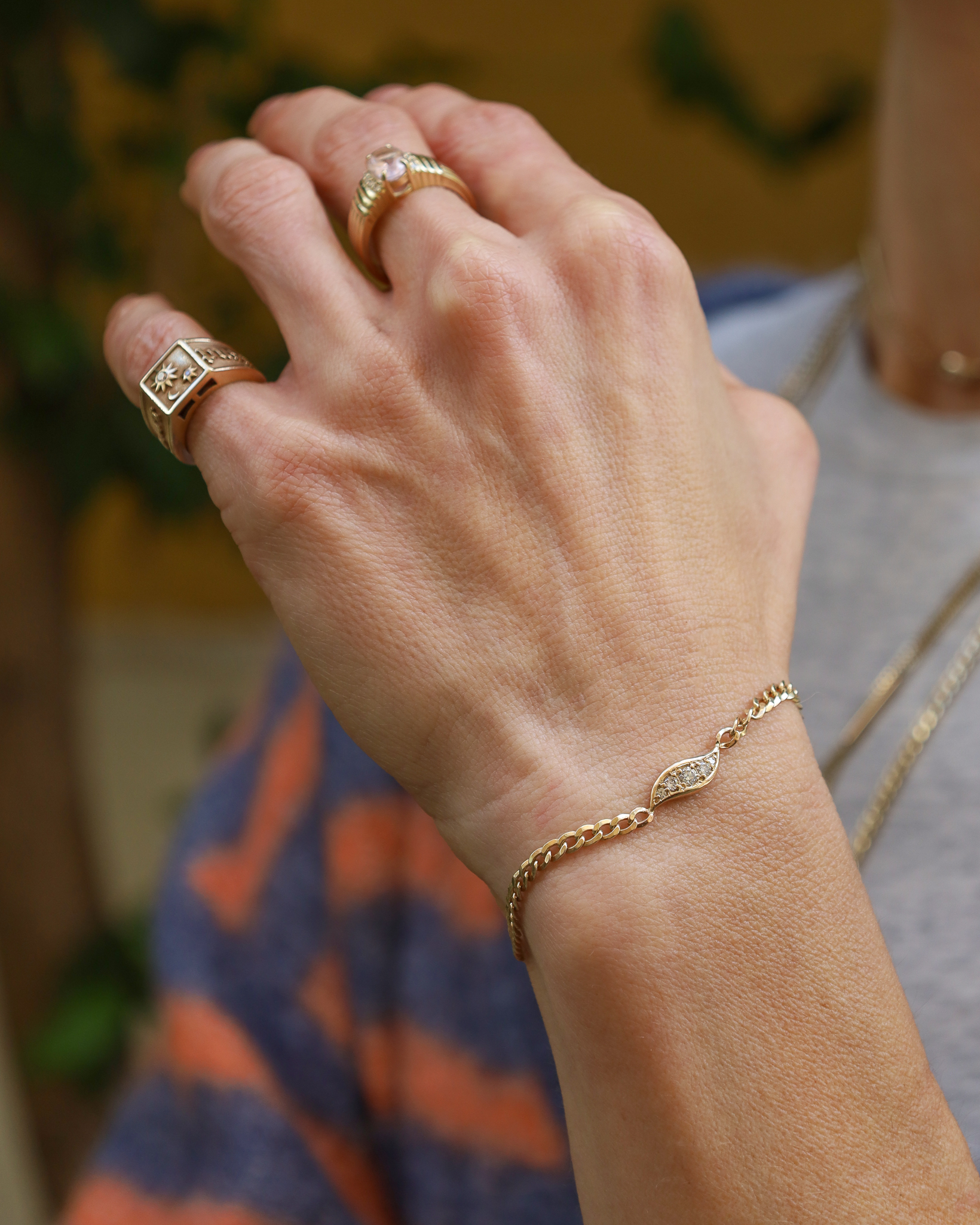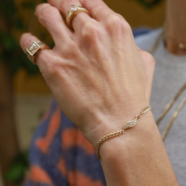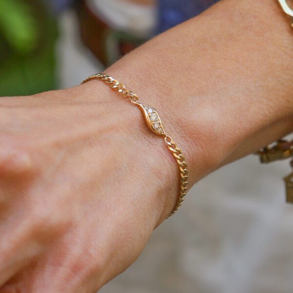 צמיד בצורת עלה מטפס, בעל מראה ייחודי ונוכח — מצד אחד עדין ומעודן, ומצד שני מנצנץ ולא משאיר מקום לספק.