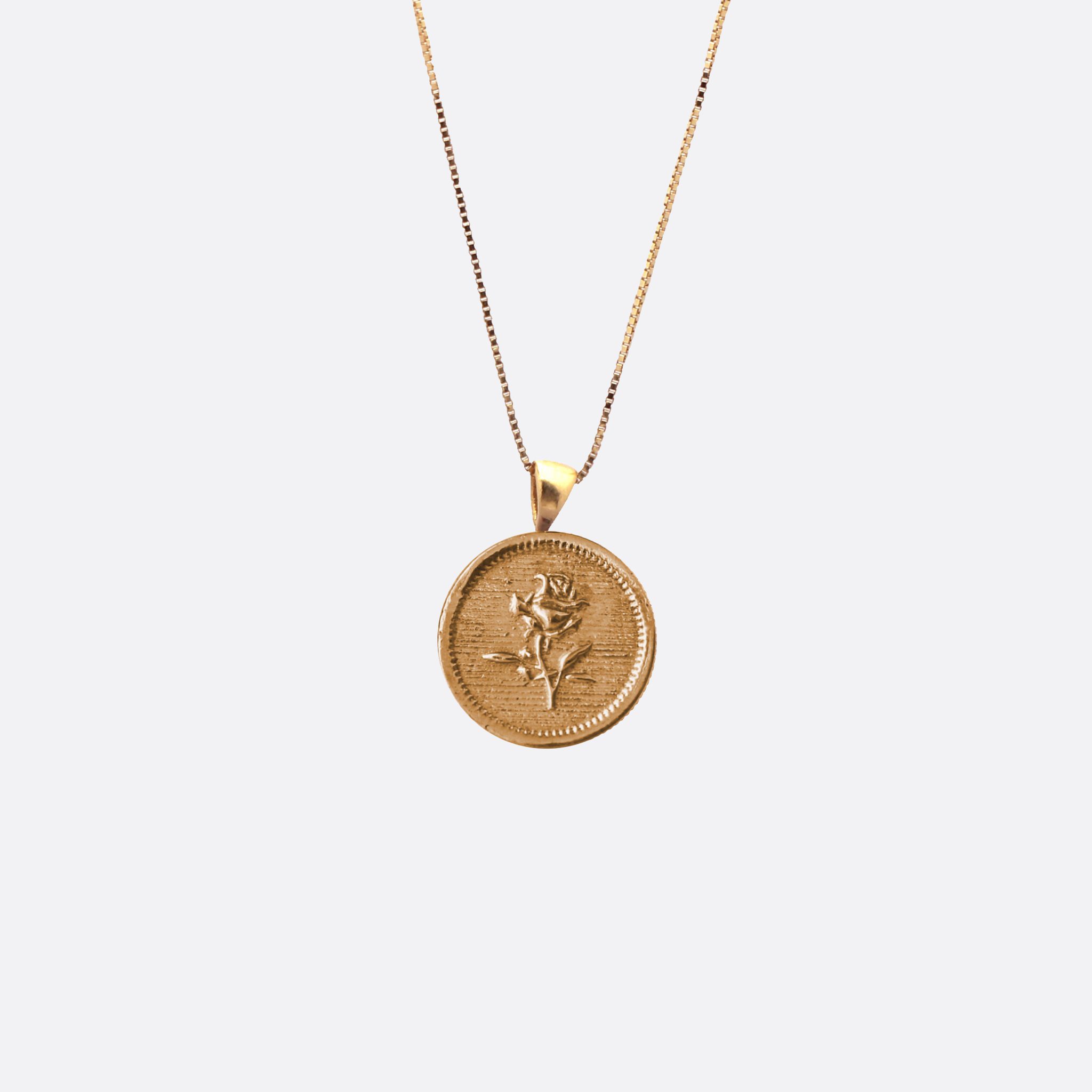 שרשרת זהב 14 קראט, דקה קלאסית ועדינה באורך 45 ס”מ עם תליון מטבע וורד קטן בקוטר 1.3 ס״מ.