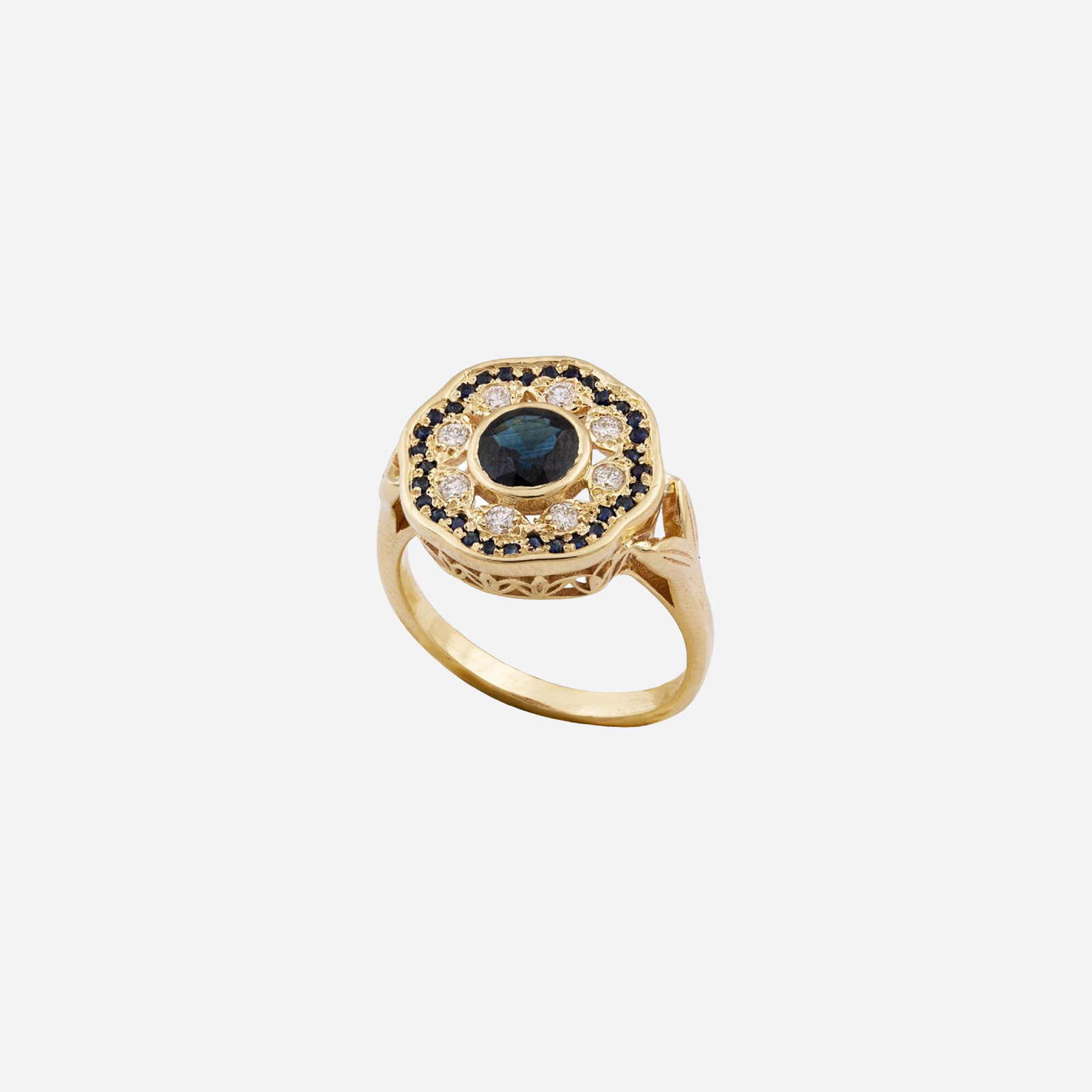 Uniquely designed gold ring set with 0.85ct blue natural sapphire surrounded by a total of 0.18ct diamonds (VS clarity grade) and blue small sapphires of 21ct total.